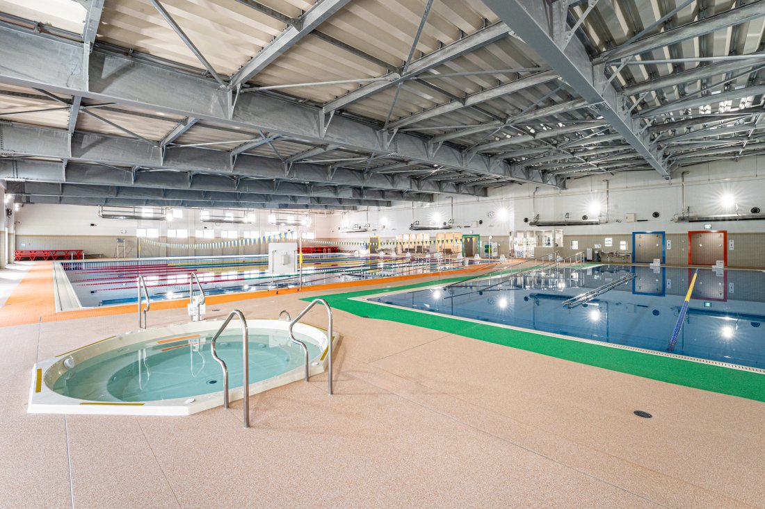 建物2階には観覧席や多目的スペースがあり、子どものスイミングを見守る家族やレクリエーションで訪れる利用者にも対応。清潔感のある更衣室やシャワーブースなどもあって、安心して利用できる環境が整っています。