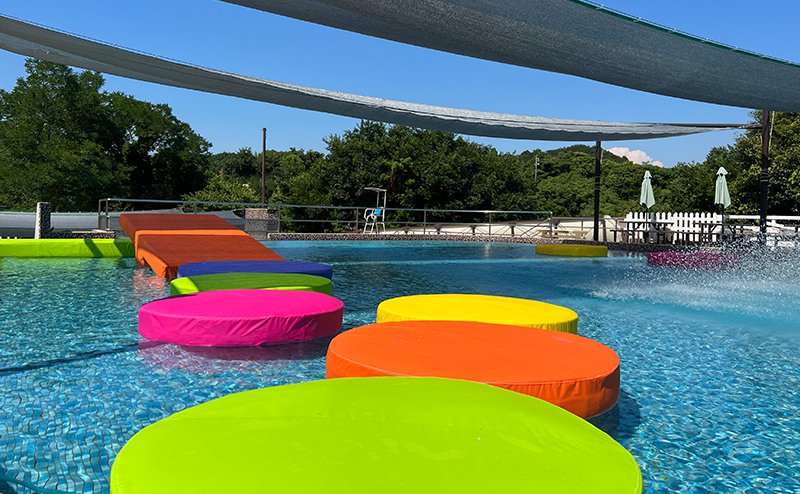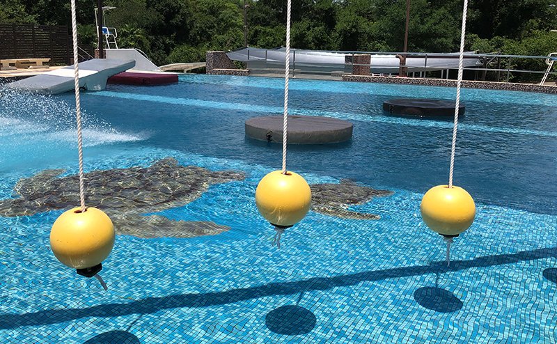 フロートや浮島、滑り台など多彩な遊具が設置されており、水の抵抗も相まって普段と違う遊び心地が味わえます。