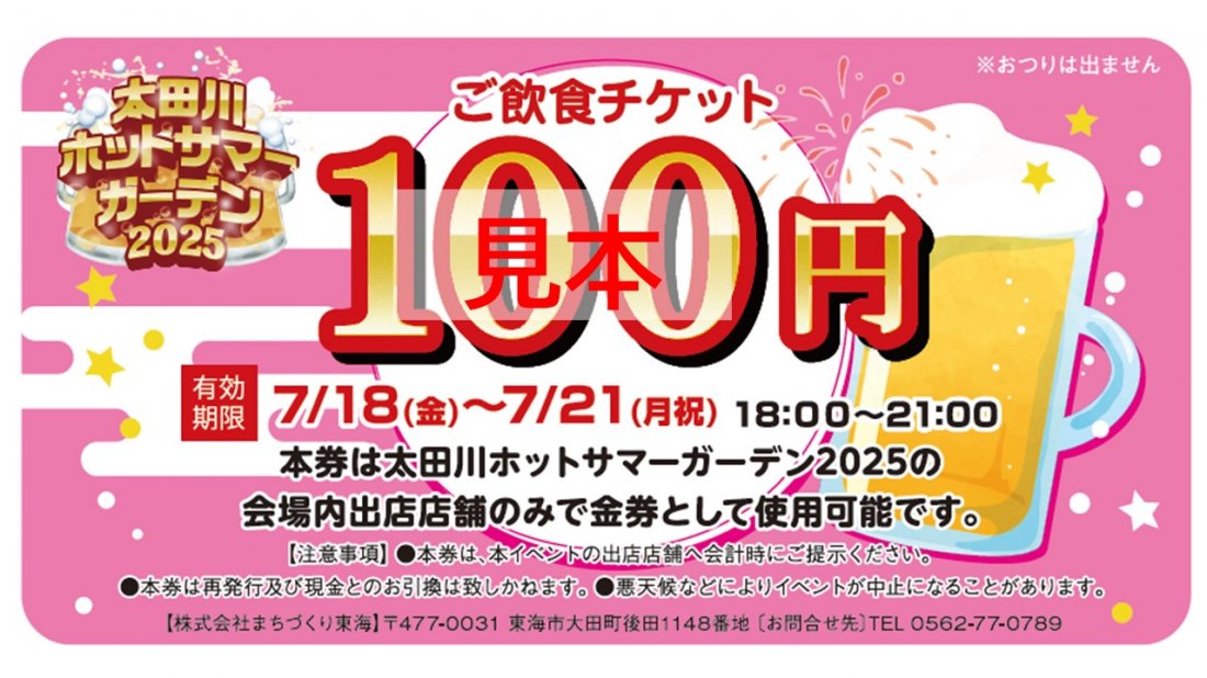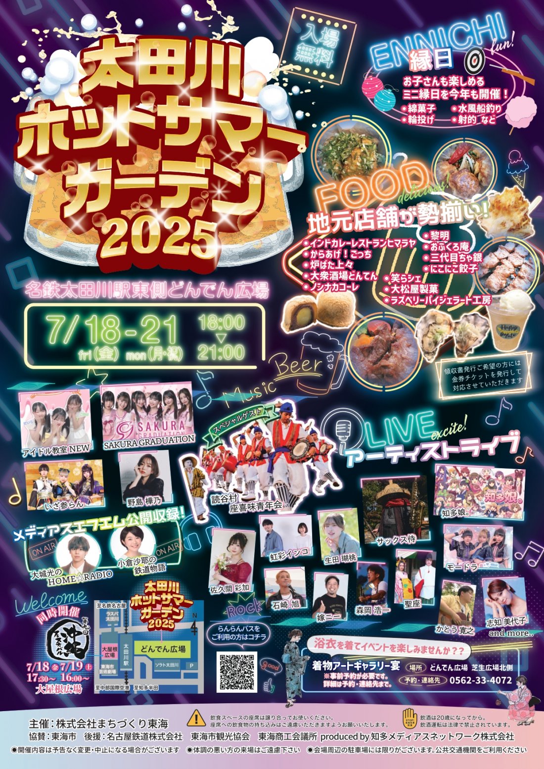 太田川ホットサマーガーデン2025 住所 東海市大田町下浜田102-1(名鉄太田川駅東側 どんでん広場) 電話 0562-77-0789(まちづくり東海) 駐車場 有(名鉄太田川駅東公共駐車場) 公式サイト https://www.tokaikanko.com/ Facebook HOTSUMMERGARDEN |