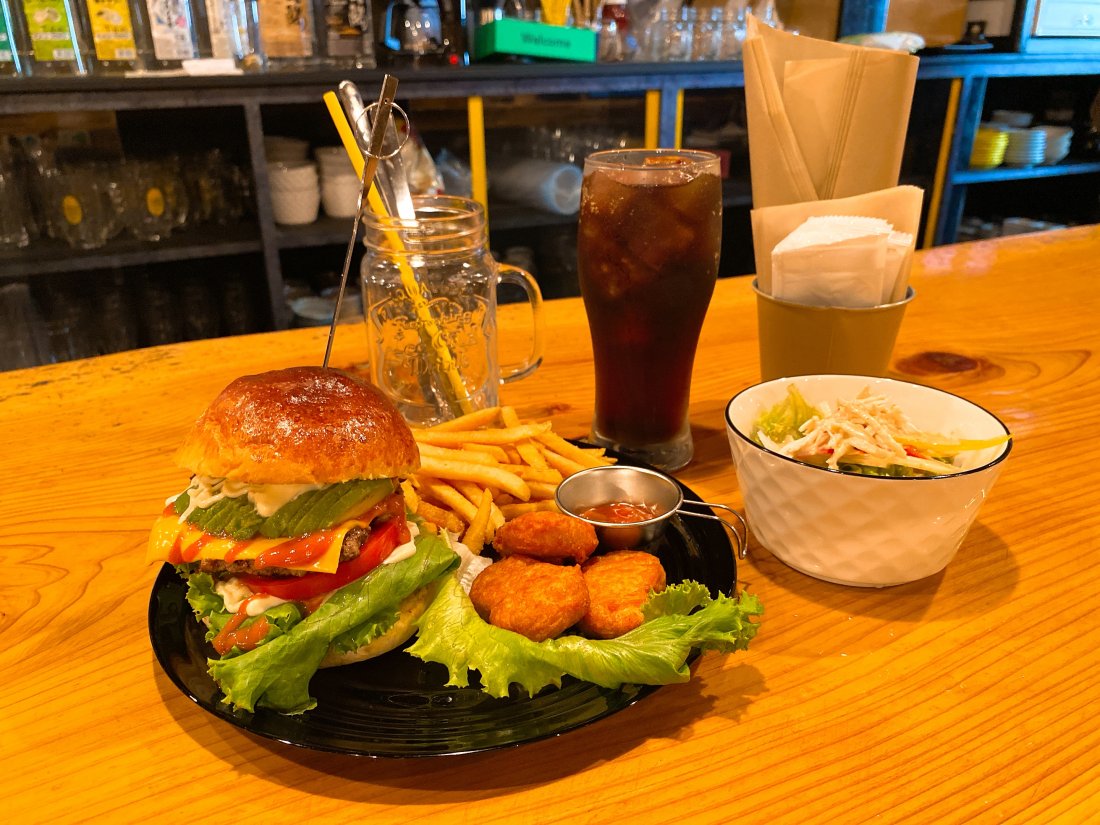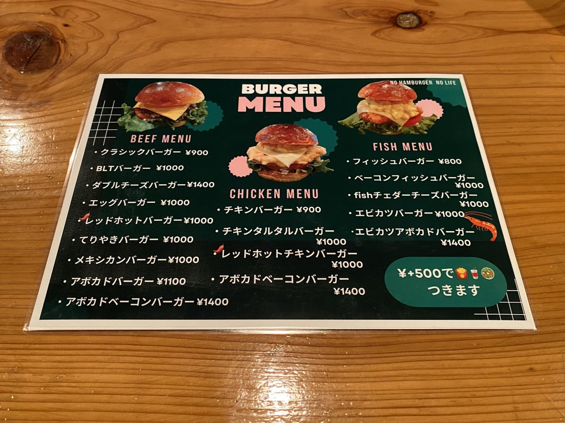 バーガーメニューは、ビーフ・チキン・フィッシュと種類豊富で、全18種類。ランチセットにすると、+500円でサラダ・ポテトorナゲット・ドリンクが付いてきます。