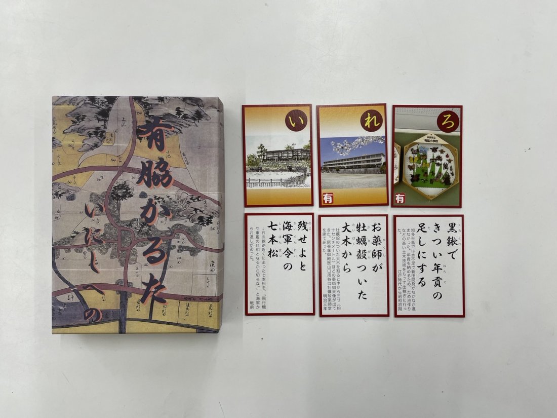 半田市有脇地区に伝わるご当地カルタ。有脇の歴史や伝統、祭りなどを取り上げた読み札と絵札で、有脇小学校や有脇公民館に保管されています。小学校では教材としても使われ、かるた遊びを通じて自分たちの住む郷土について学ぶことができます。