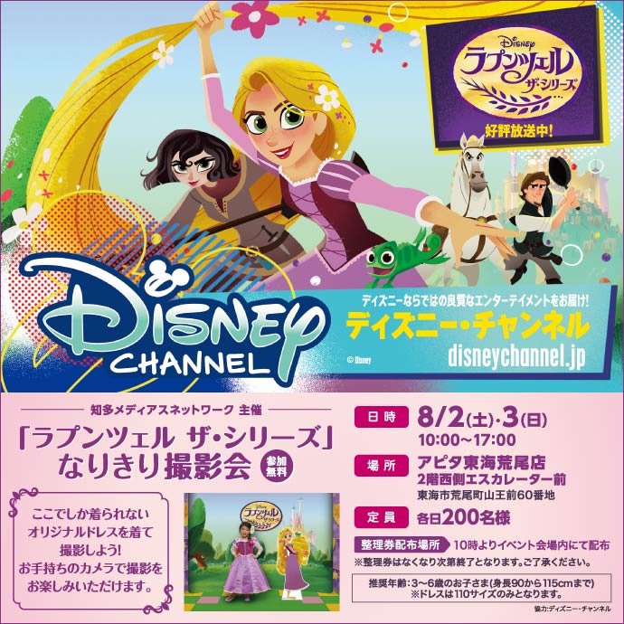 【参加無料】8月2日(土)・3日(日)、アピタ東海荒尾にて「ラプンツェル ザ・シリーズ」なりきり撮影会を開催! ここでしか着られないオリジナルドレスを着て、ラプンツェルになりきって写真を撮ろう♪ お手持ちのカメラで自由に撮影OK! 当日10時よりイベント会場内で整理券を配布します。当日参加も大歓迎! 整理券は先着順、なくなり次第終了です。ぜひご家族と一緒に、夏の思い出を作りに来てくださいね! 8/3 追記 イベントは終了しました。 沢山のご参加ありがとうございました。