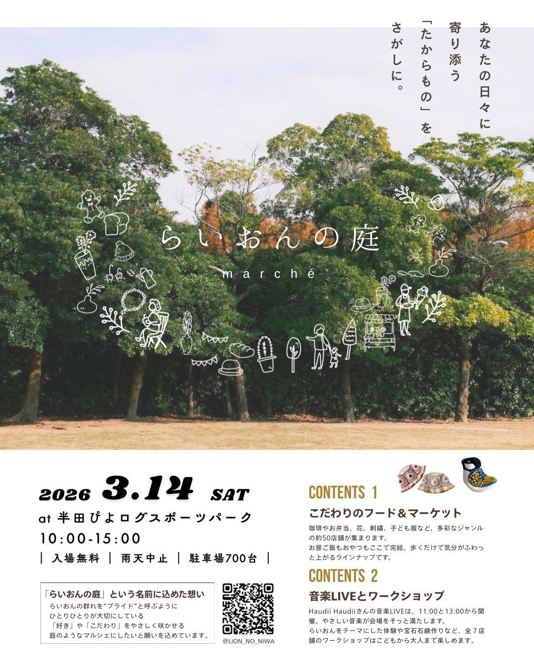 らいおんの庭 住所 半田市池田町3-1-1(半田ぴよログスポーツパーク) 日時 2026年3月14日(土) 10:00~15:00 駐車場 有(700台)