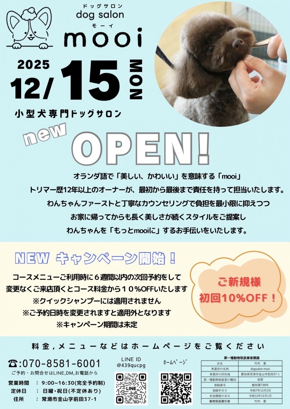dog salon mooi (ドッグサロン モーイ) 住所 常滑市金山前田37-1 電話 070-8581-6001 営業時間 9:00~16:30 定休日 日曜、祝日休(不定休有) 駐車場 有