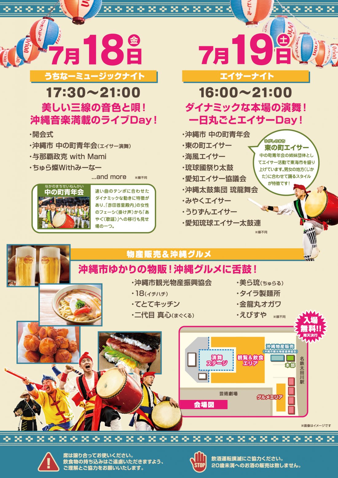 沖縄フェスティバル 住所 東海市大田町後田52(名鉄太田川駅西側 大屋根広場) 電話 0562-77-0789(まちづくり東海) 駐車場 有(太田川駅東公共駐車場) 公式サイト http://tm-tokai.com/archives/9165/ |