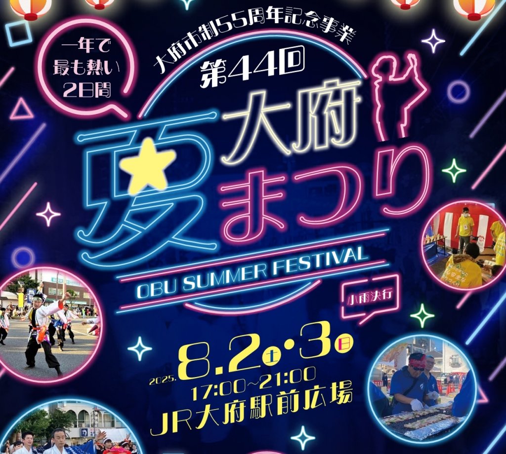 第44回 大府夏まつり (おおぶなつまつり) 住所 大府市中央町3-135(JR大府駅東口 ロータリー付近) 電話 0562-48-1007(大府公民館) 駐車場 無(公共交通機関の利用を推奨) 公式サイト https://obu-kankou.gr.jp/info/post-1857/ Instagram obukanko |