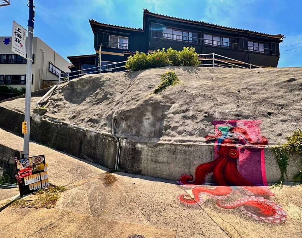 場所は西港から徒歩10分、坂の上にある「旬味覚の宿 上海荘」前でダイナミックなタコの絵が目印です。