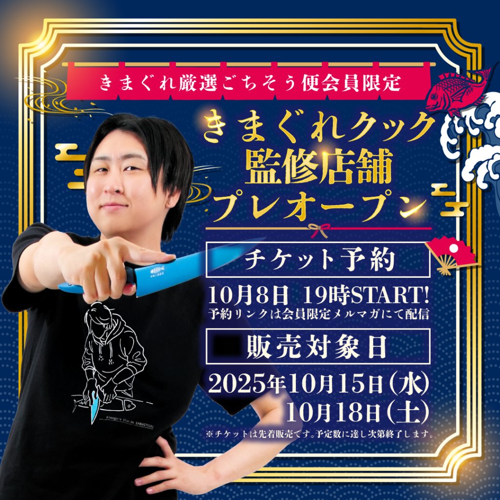 こちらは「きまぐれ厳選ごちそう便」という、旬の海鮮が毎月届く定期便サービスの会員限定のプレオープン企画。10月15日(水)・18日(土)開催予定だそうで、昨日10月8日(水)よりチケット予約が始まっています(予定数に達し次第終了)。