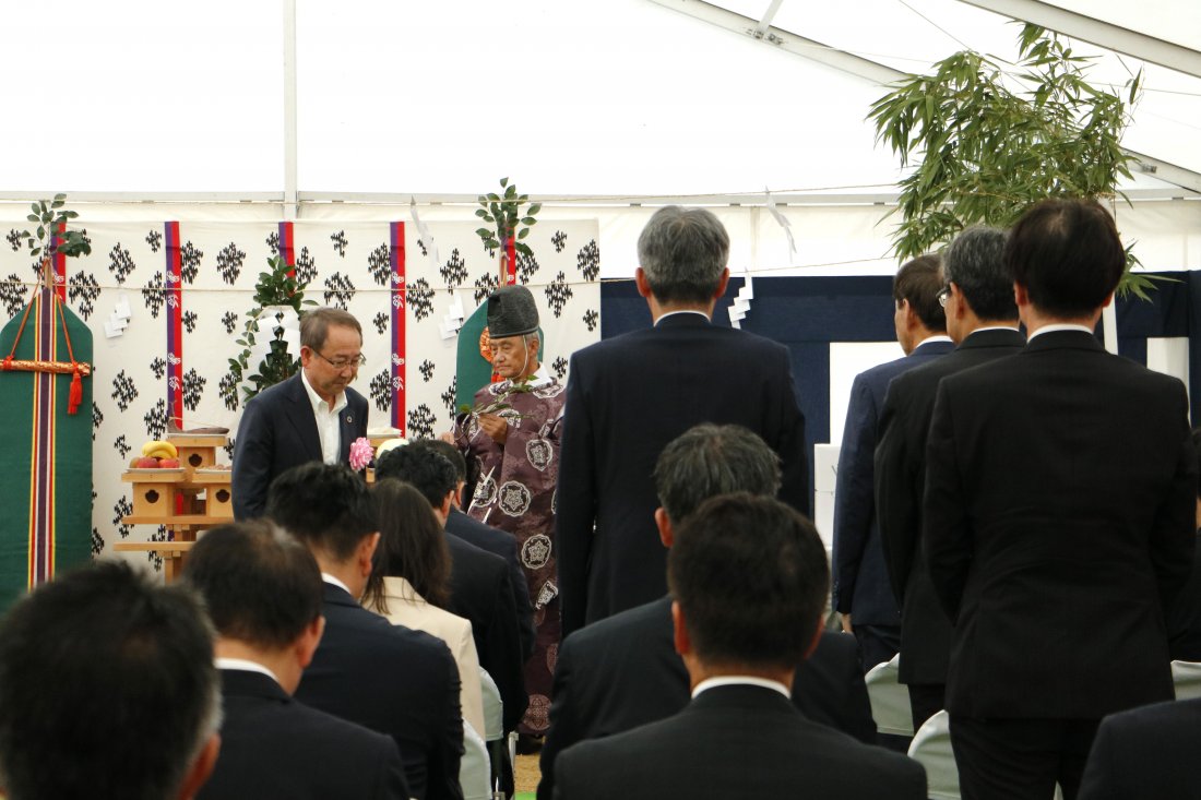 式典には、花田勝重東海市長をはじめ、設計・施工を担当する西松建設株式会社代表取締役社長・細川雅一(ほそかわ・まさかず)氏、プロロジス代表取締役会長兼CEO・山田御酒(やまだ・みき)氏らが参列。関係者による神事が執り行われ、工事の安全と事業の発展を祈願しました。