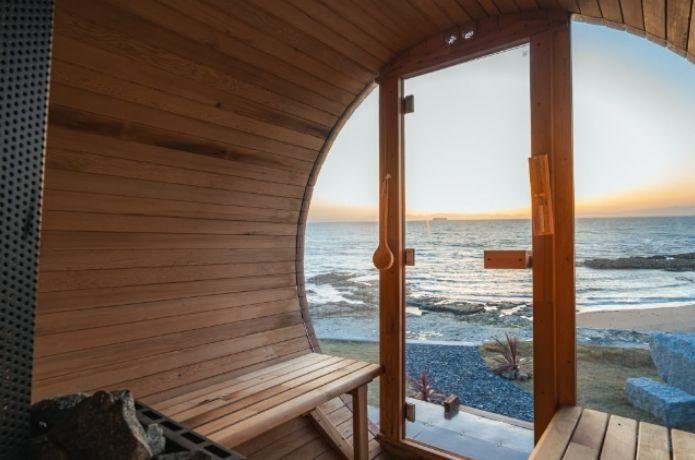 貸切できるプライベート感満載のサウナ室は、オーシャンビューを一望できる絶景ロケーション。薪ストーブで好みに応じて温度調整でき、夏季には100℃近くの高温サウナを体験できます。