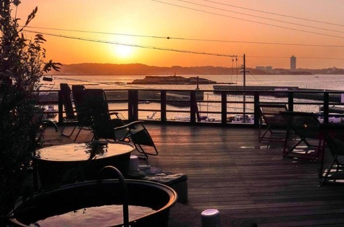 外気スペースでは、伊勢湾に沈みゆく夕日を眺めながら海風に当たって涼むことができます。