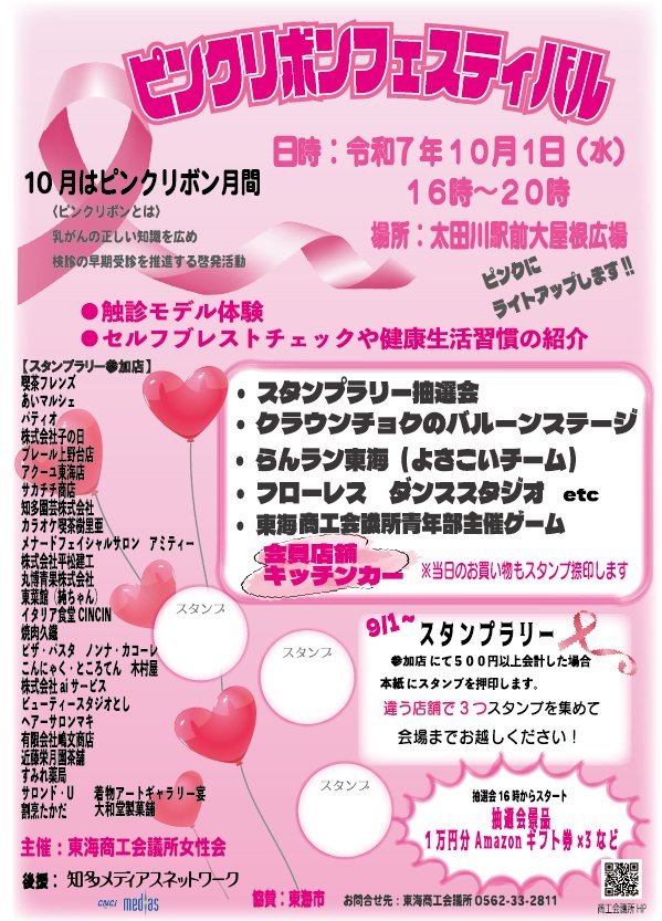 ピンクリボンフェスティバル 住所 東海市大田町下浜田(名鉄太田川駅前大屋根広場) 電話 0562-33-2811(東海商工会議所) 駐車場 無(近隣にコインパーキング有) 公式サイト https://www.tokai-cci.or.jp/ |