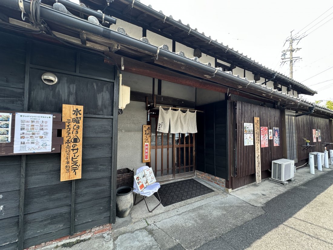 専用駐車場はないので、公式で案内されている近隣の「おかき屋 辰心」へ駐車。レトロなまち並みを歩くこと約3分。古民家が目の前に。