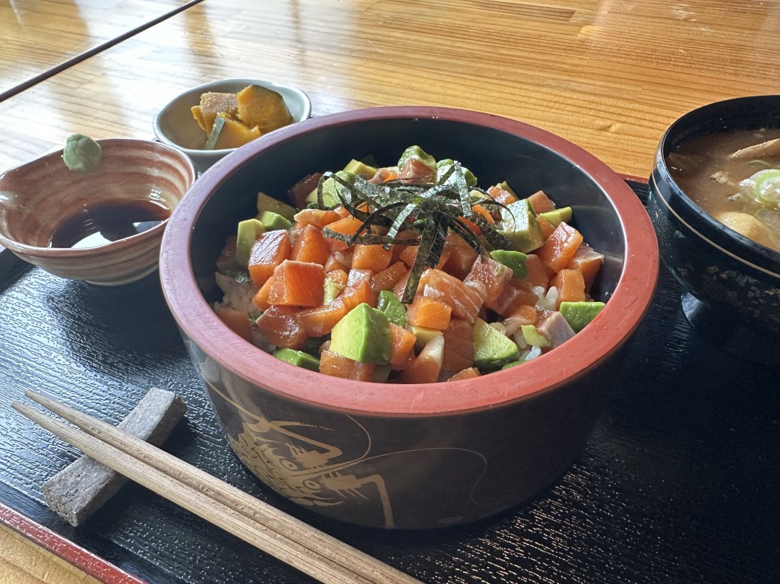 今回は、「知多クールサーモン」を使用した「知多クールサーモン アボカド丼(1,200円)」と、週替わりの「本日のおにぎりランチ(1,150円)」を注文。※2025年9月取材時点の価格