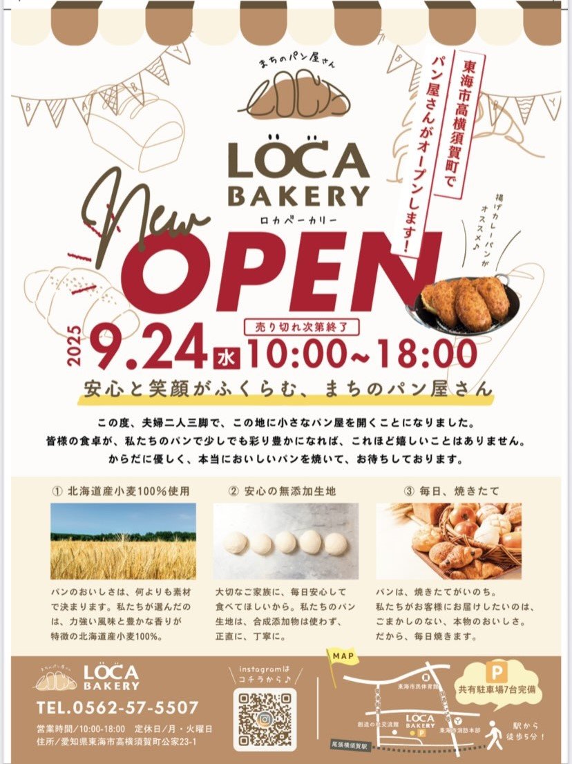 LOCA BAKERY (ロカ ベーカリー) 住所 東海市高横須賀町公家23-1 電話 0562-57-5507 営業時間 10:00~18:00 定休日 月曜、火曜休 駐車場 有(共同7台) Instagram __locabakery |
