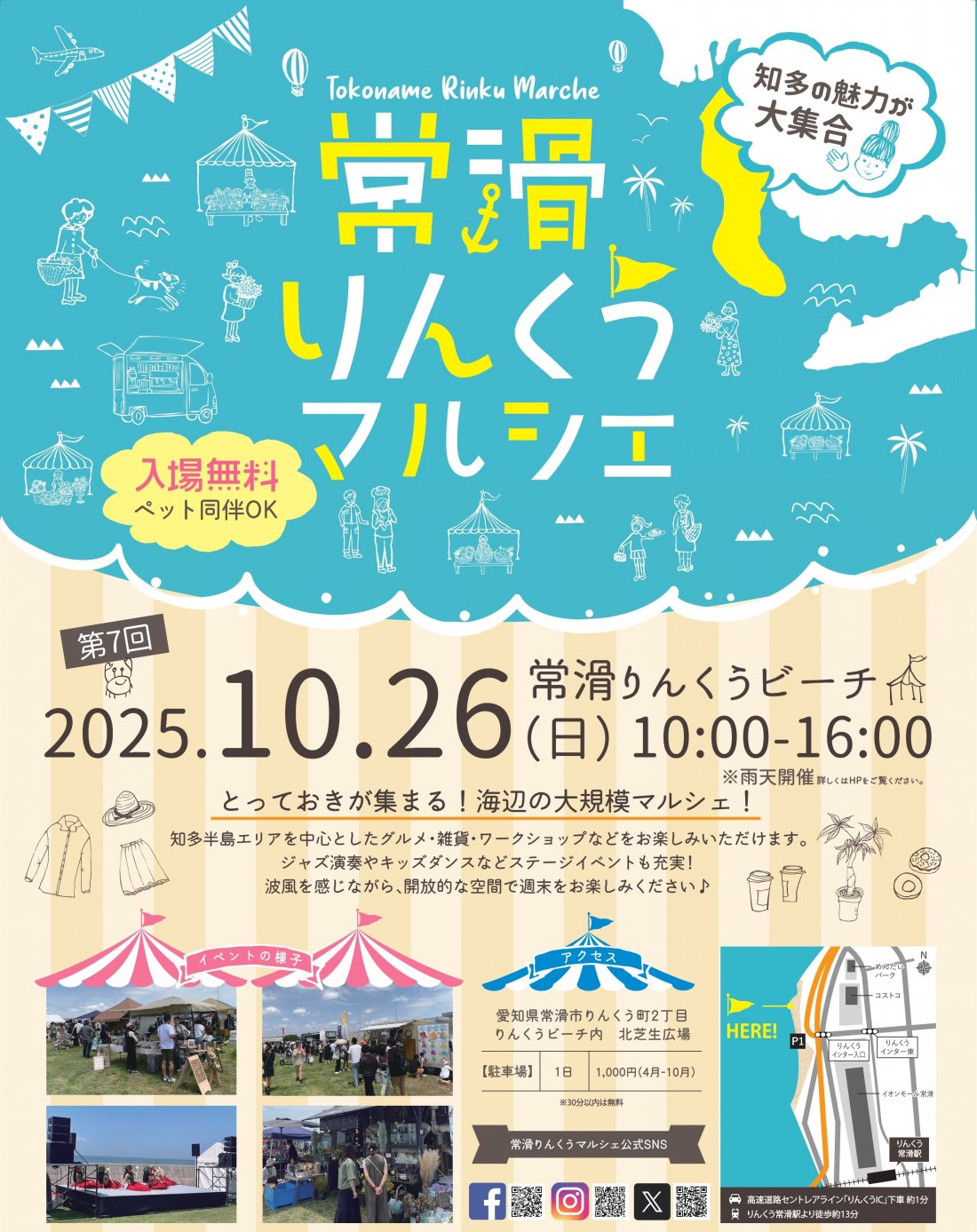 第7回 常滑りんくうマルシェ 住所 常滑市りんくう町2(りんくうビーチ 北芝生広場) 出店時間 10:00~17:00 駐車場 有(4月~10月 1日1,000円)※30分無料 公式サイト https://rinku-beach.jp/event/marche/ Instagram tokoname_rinku_marche |