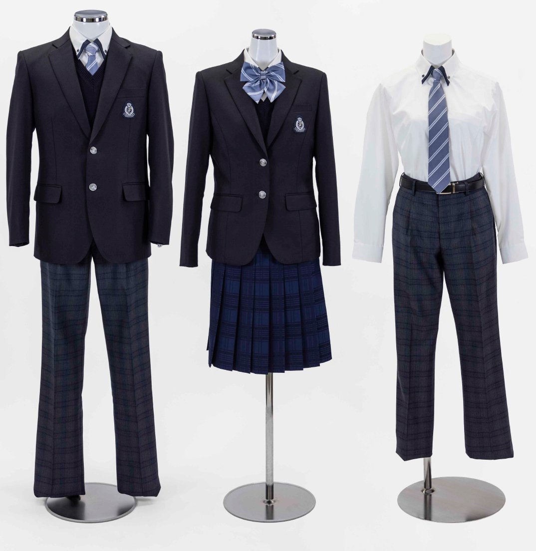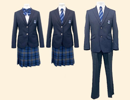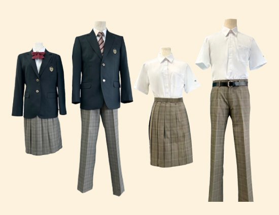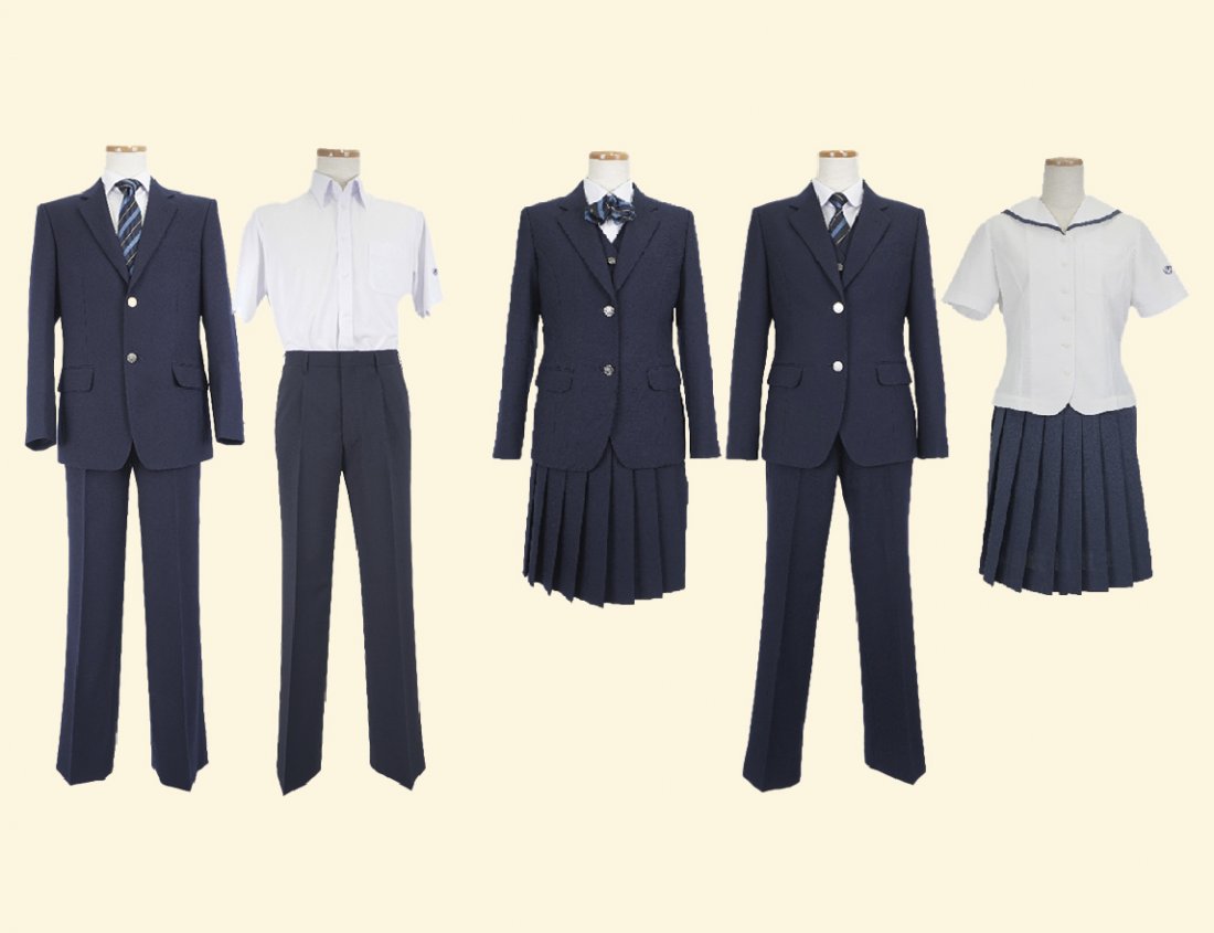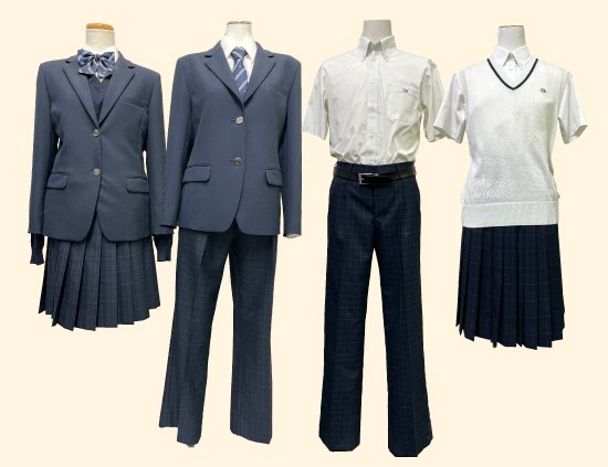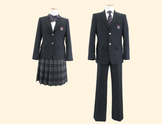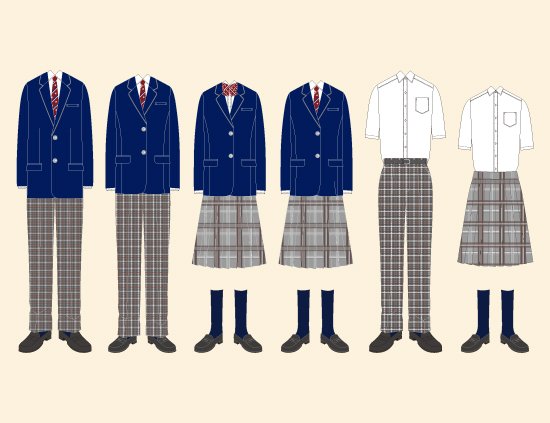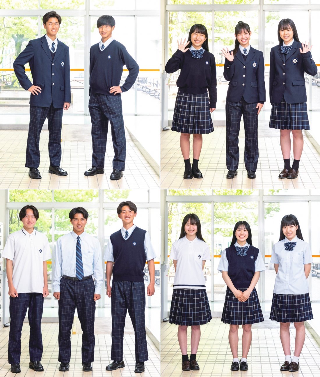 標準型に男女の区別はなく、紺のブレザーにグレーを基調としたチェック柄のスラックス、スカート、キュロットから選択できます。首元はネクタイまたはリボンを着用。その他、季節に合わせて使える学校指定の紺のカーディガン、白または紺のベストがあります。夏季は開襟のシャツですが、現在は指定した時期(5月頃~10月頃)は白無地(ワンポイントなら可)の私物のポロシャツも認められています。※ポロシャツは式典や行事の場合は着用不可
