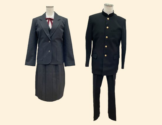 2025年度までは男子は黒の詰襟、女子はグレーのシングルブレザーとスカートもしくはスラックス、赤のリボンです。