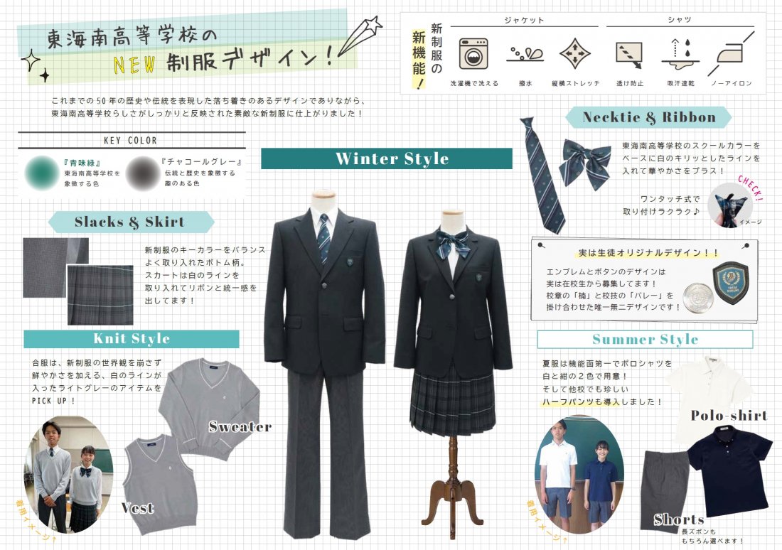 2026年度より導入される新制服は、青味緑とチャコールグレーを基調としたブレザーにスラックスまたはスカート。合服にはライトグレーの長袖かベストの2タイプのセーター、夏は白または紺色のポロシャツに他にはないちょっと珍しいハーフパンツもあり、生徒自身が自由に選択して着用することができます。またジャケットは伸縮性があり自宅での洗濯も可能、吸汗速乾性のあるシャツはノーアイロンでOKと機能性にもこだわっています。 【基本情報】 |