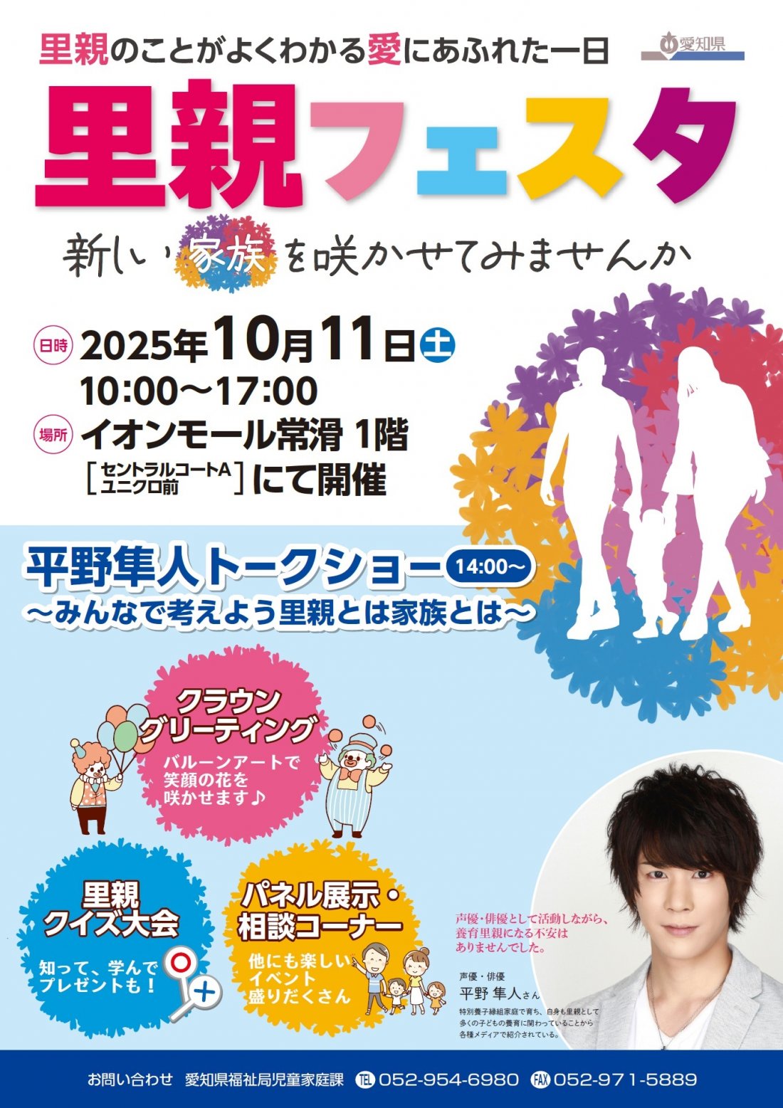 里親フェスタ 住所 常滑市りんくう町2-20-3 イオンモール常滑1F セントラルコートA お問い合わせ 052-954-6980(愛知県福祉局児童家庭課)