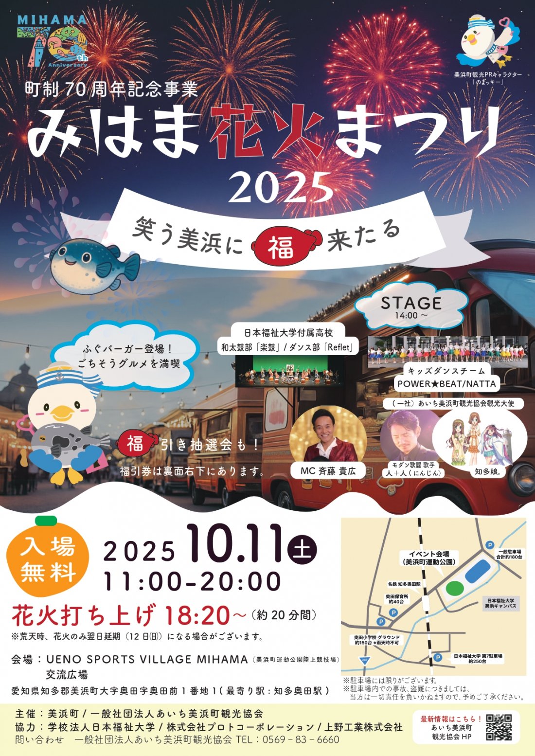 みはま花火まつり2025~笑う美浜に福来たる~ 住所 美浜町奥田奥田前1ー1 電話 0569-83ー6660(美浜町観光協会) 駐車場 有