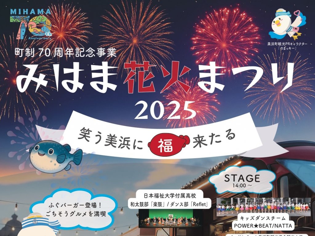 みはま花火まつり2025~笑う美浜に福来たる~ 住所 美浜町奥田奥田前1ー1 電話 0569-83ー6660(美浜町観光協会) 駐車場 有