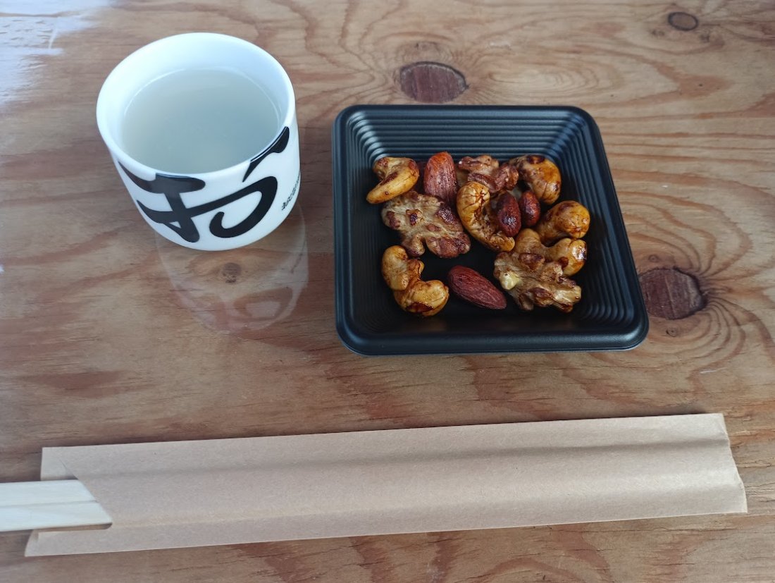 私は、日本酒は「敷嶋とKTとあいちのおこめ」、おつまみには「傳右衛門たまりの黒ローストナッツ」をチョイスしました。