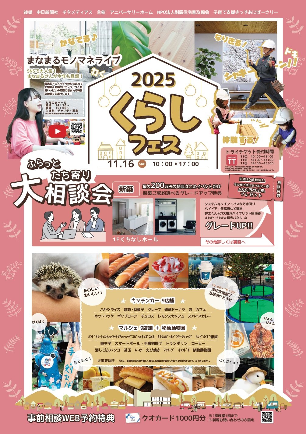 株式会社アニバーサリーホーム 住所 大府市柊山町3-236(本社) 電話 0120-65-6337 営業時間 9:00~18:00 定休日 水曜、祝日、年末年始休 公式サイト https://anniversary-home.jp/info/kurashifesu2025/ Instagram anniversaryhome_ |