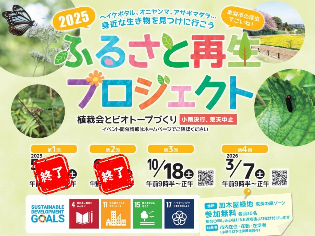 ふるさと再生プロジェクト 第3回 住所 東海市加木屋町雉子野2-6 日時 10月18日(土)9:30~12:00 駐車場 有 お問い合わせ 052-613-7811(東海市花と緑の推進課) 公式サイト https://www.city.tokai.aichi.jp/shisei/1003593/1003640/1003664.html |