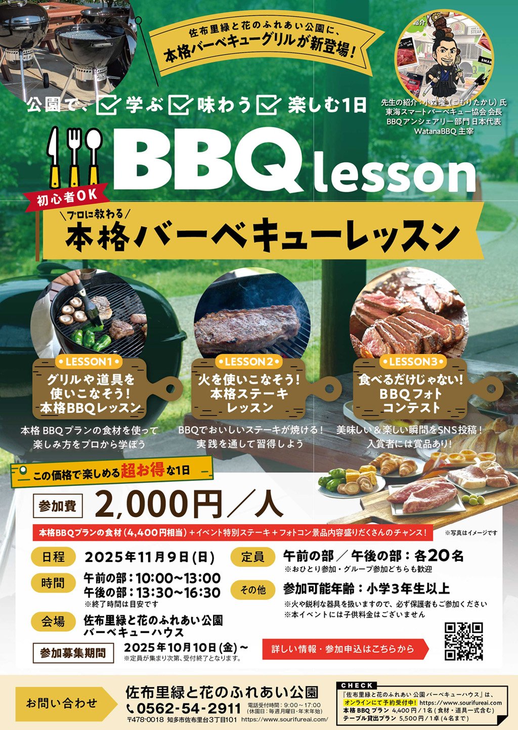佐布里緑と花のふれあい公園 本格バーベキューレッスン 住所 佐布里緑と花のふれあい公園 バーベキューハウス(知多市佐布里台3-101) 電話 0562-54-2911(緑と花のふれあい公園内 梅の館 ※月曜休) 日時 11月9日(日) 午前の部 10:00~13:00/午後の部 13:30~16:30(終了時間は目安)
