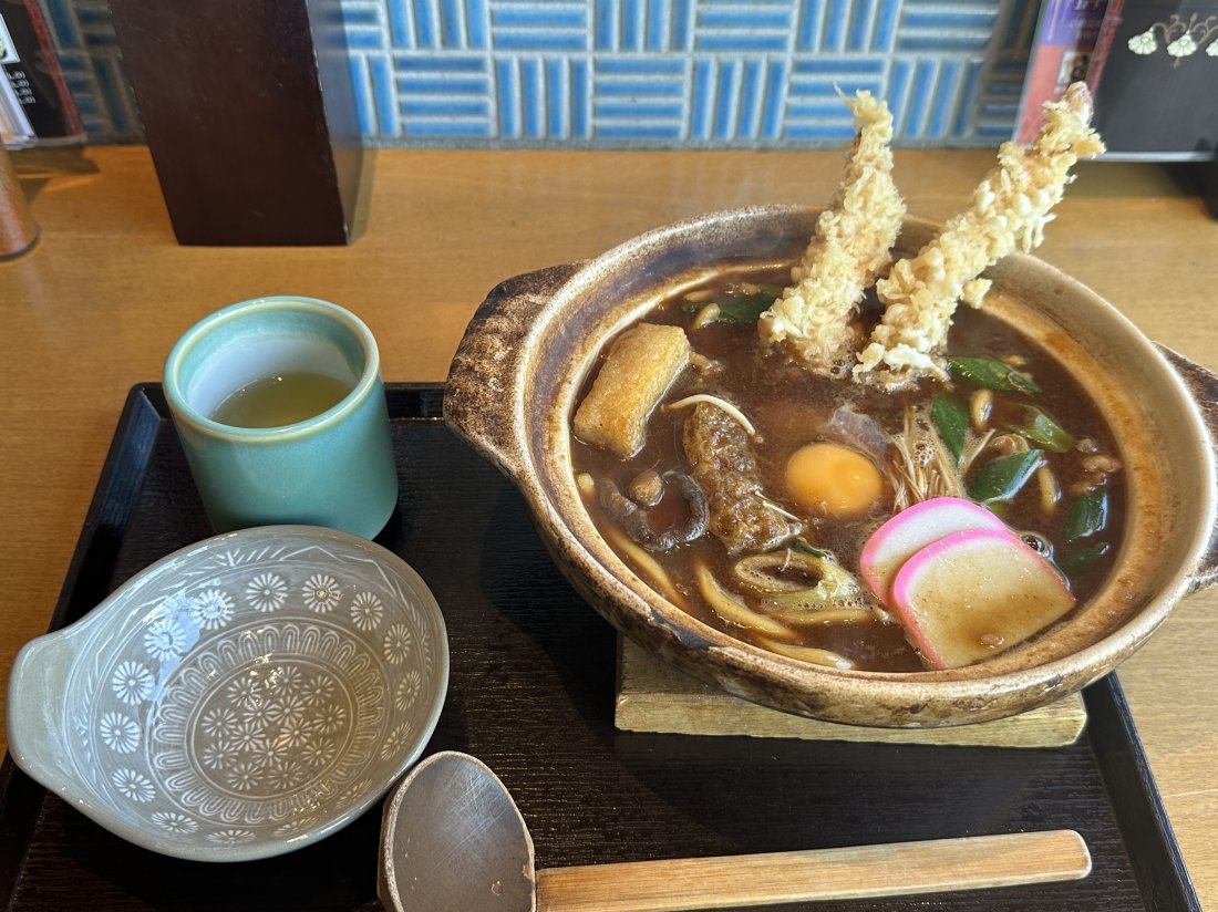 今回は、「えび天みそ煮込み(1,375円)」を注文。味噌煮込みうどんならではの固めの麺に、エビ天が2本ついているのが特徴です。