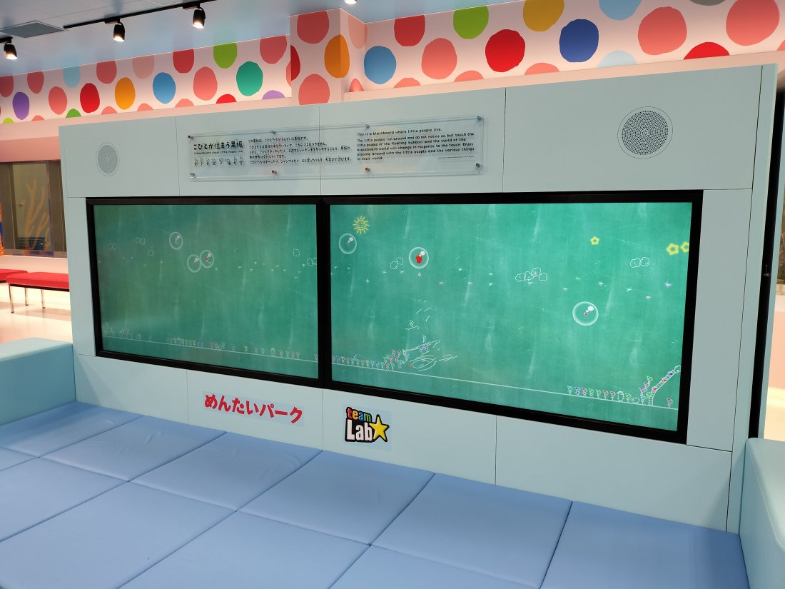 大画面にタッチしてゲーム感覚で遊べる遊具は、タッチしたり線を引くことにより、黒板の中に住むこびと達を動かせる創造的な展示。