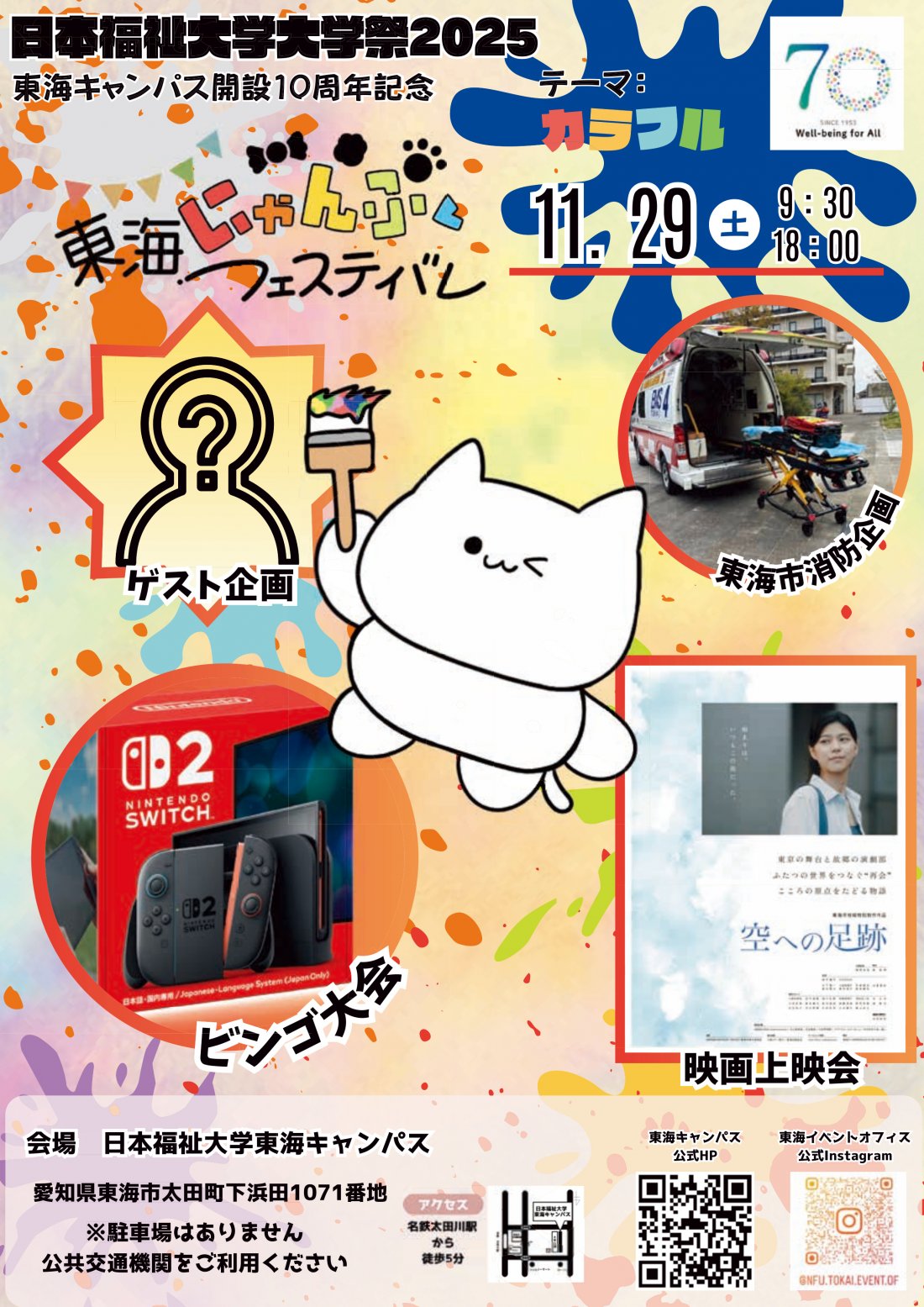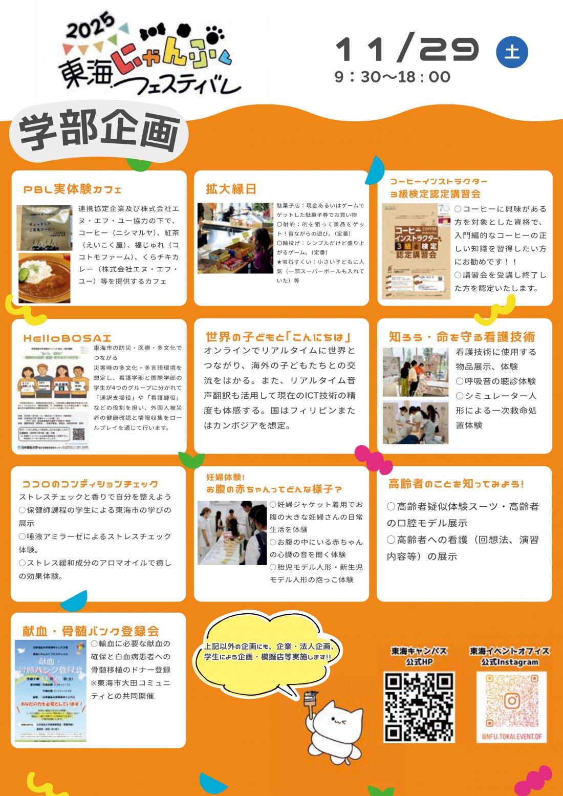 東海にゃんぷくフェスティバル 住所 東海市大田町下浜田1071(日本福祉大学 東海キャンパス) 日時 11月29日(土)9:30~18:00 Instagram nfu.tokai.event.of 公式サイト https://www.n-fukushi.ac.jp/festival/tokai.html |