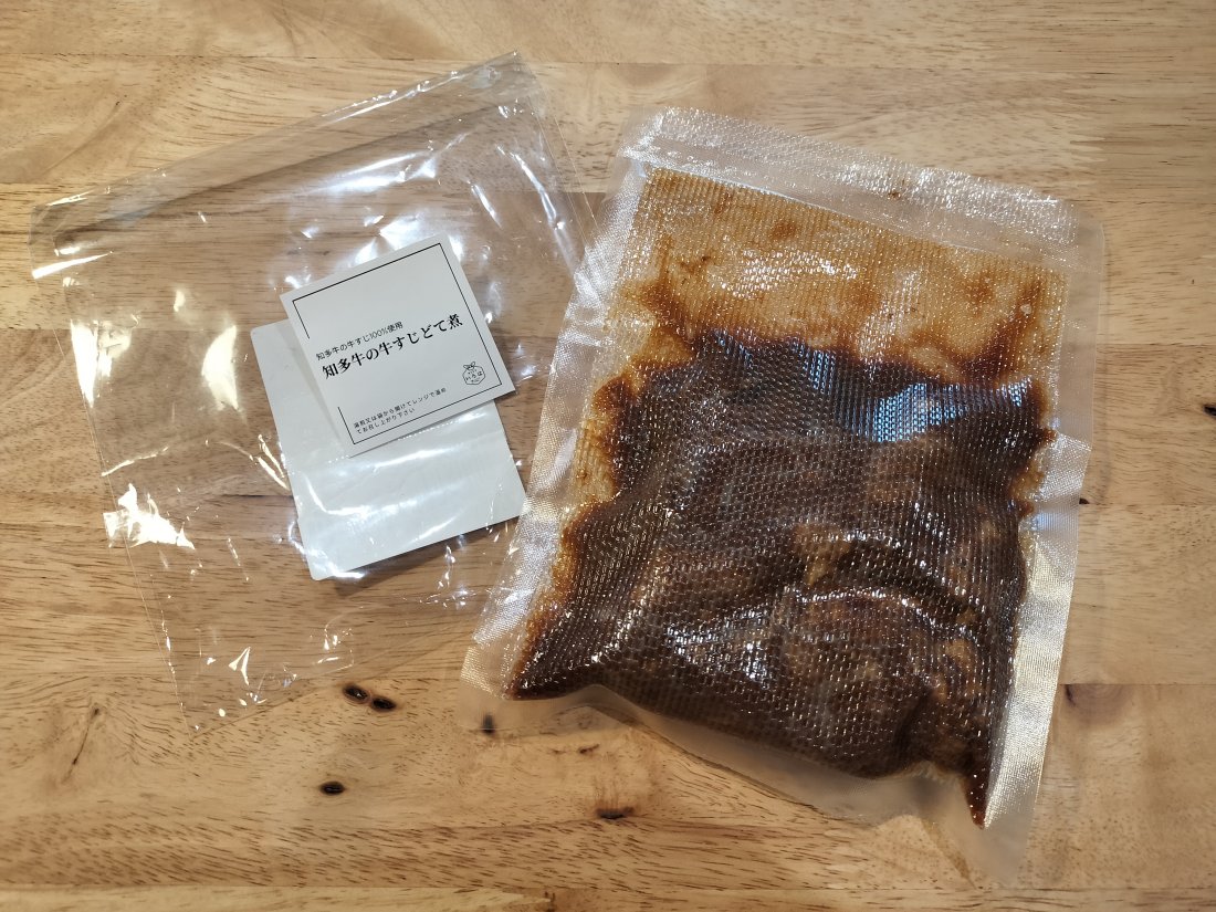 「知多牛の牛すじどて煮」と「知多牛ハンバーグ」、どちらも知多牛100%の商品だそう。