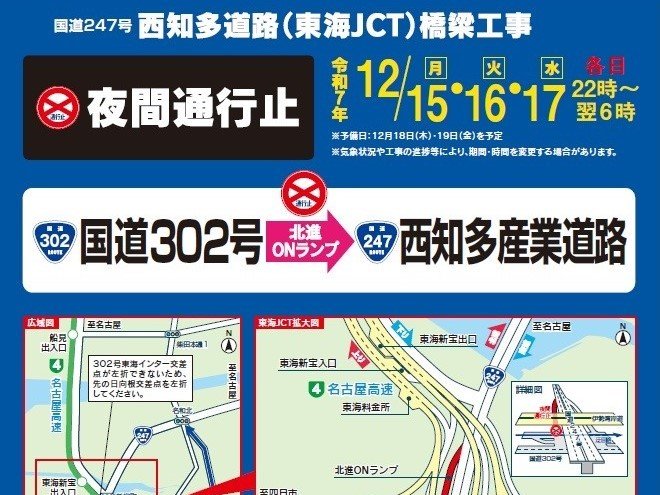 西知多道路橋梁工事(東海JCT) (にしちたどうろきょうりょうこうじ とうかいジャンクション) 住所 東海市新宝町周辺 お問い合わせ 050-3369-6623(日本道路交通情報センター※道路交通情報に関して) 0800-888-2475(国土交通省 愛知国道事務所 交通規制コールセンター ※工事に関して)
