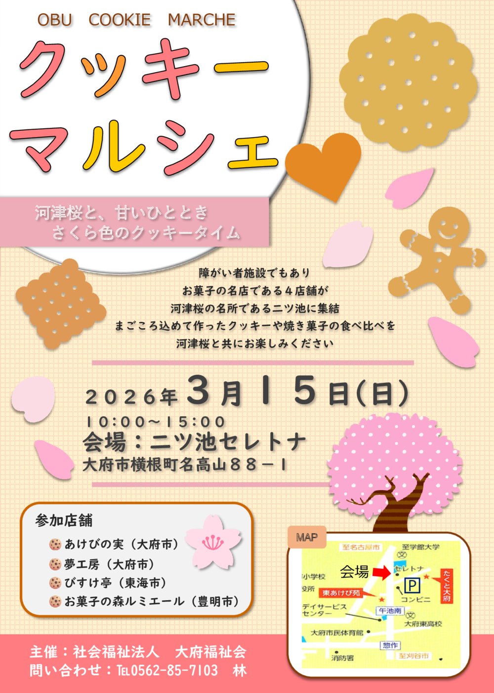【内容】河津桜の名所「二ツ池」で、障がい者福祉施設4団体が手作りしたクッキーなどを販売します。河津桜とともにおいしいクッキーをお楽しみください。
