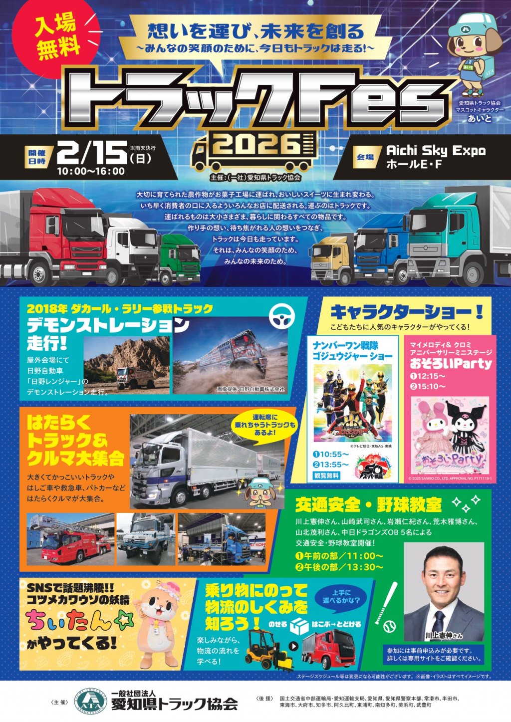 トラックFes 2026 (トラックフェス) 住所 常滑市セントレア5-10-1 Aichi Sky Expo ホールE・F 駐車場 有 公式サイト https://truckaichi.com/information/truckfes2026/ X aitokyo1009 |