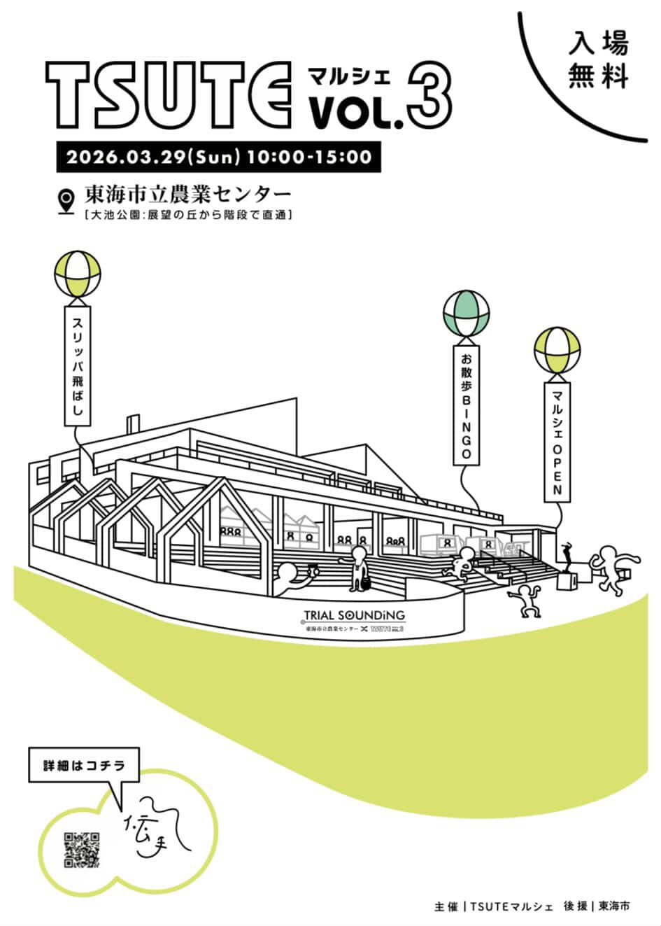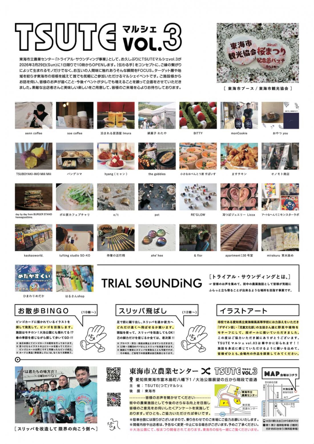 TSUTEマルシェ vol.3 (ツテマルシェ) 住所 東海市富木島町八幡下1(東海市立農業センター) 駐車場 有(計80台) 公式サイト https://sites.google.com/view/tsute/ Instagram tsute_marche |