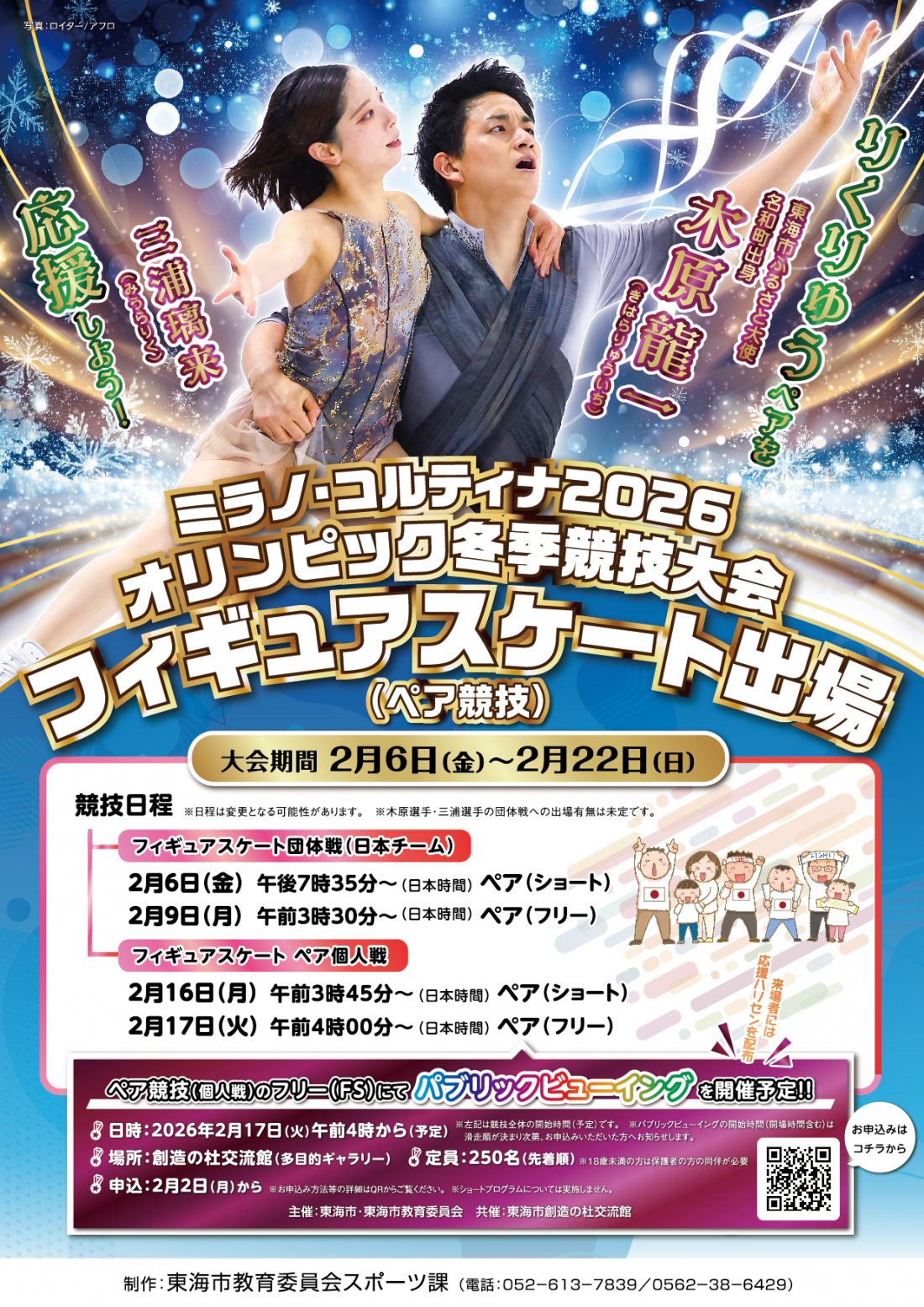 ミラノ・コルティナ2026 フィギュアスケート パブリックビューイング 場所 東海市創造の杜交流館(東海市横須賀町狐塚11) 電話 052-613-7839/0562-38-6429(東海市教育委員会スポーツ課) 駐車場 110台(東海市創造の杜交流館専用駐車場) 公式サイト https://tokai-souzou.jp/ Instagram tokai_souzounomori_koryukan |