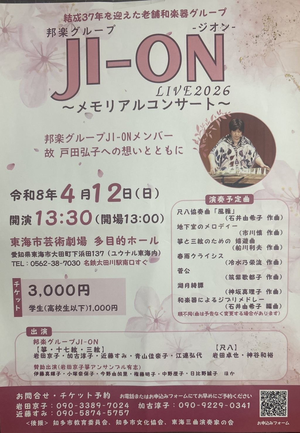 【内容】知多半島を中心に活動を続けて37年の箏、三絃、尺八グループ。今回は、昨年亡くなった大事なメンバー戸田弘子への追悼を兼ねて演奏。