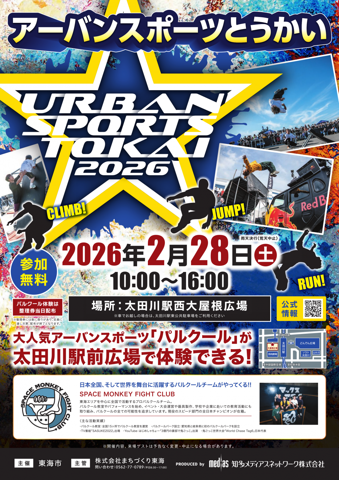 アーバンスポーツとうかい2026 住所 太田川駅西側大屋根広場 電話 0562-77-0789 駐車場 有(太田川駅東公共駐車場、公共交通機関の利用を推奨) 公式サイト https://www.city.tokai.aichi.jp/bunka/1002737/1006610/1007926.html Instagram urbansportstokai |