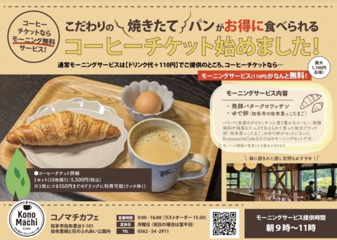 KonoMachi Cafe 佐布里緑と花のふれあい公園 (コノマチカフェ) 住所 知多市佐布里台3-101 電話 0562-54-2911 営業時間 9:00~16:00(施設は17:00まで)