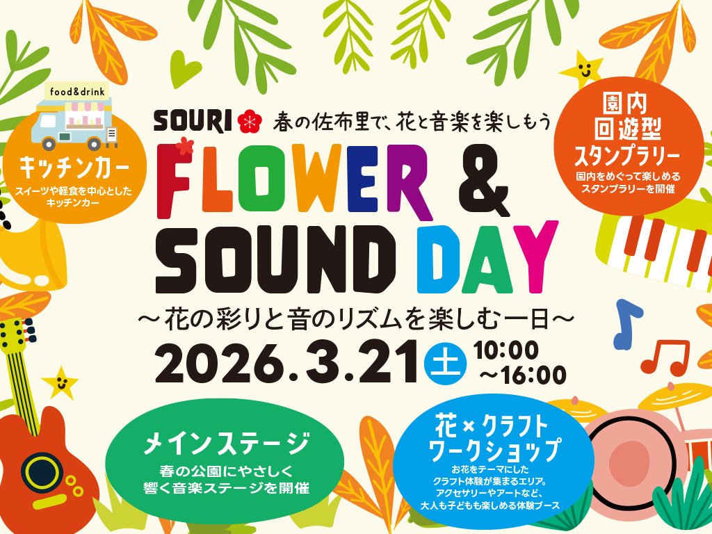 佐布里緑と花のふれあい公園 SOURI Flower & Sound Day 2026 住所 佐布里緑と花のふれあい公園 園内各所(知多市佐布里台3-101) 電話 0562-54-2911(緑と花のふれあい公園内 梅の館 ※月曜休) 日時 3月21日(土) 10:00~16:00 駐車場 有(園内4か所に無料駐車場300台分) 公式サイト https://www.sourifureai.com/ Instagram sourifureai |
