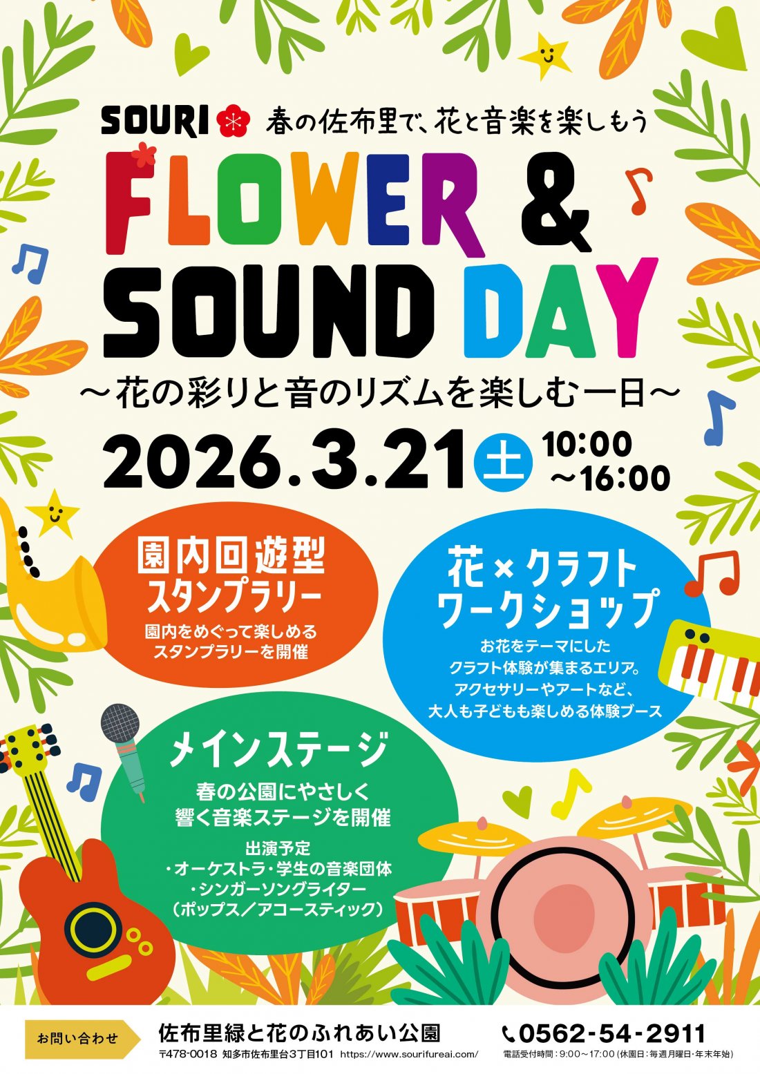 佐布里緑と花のふれあい公園 SOURI Flower & Sound Day 2026 住所 佐布里緑と花のふれあい公園 園内各所(知多市佐布里台3-101) 電話 0562-54-2911(緑と花のふれあい公園内 梅の館 ※月曜休) 日時 3月21日(土) 10:00~16:00 駐車場 有(園内4か所に無料駐車場300台分) 公式サイト https://www.sourifureai.com/ Instagram sourifureai |