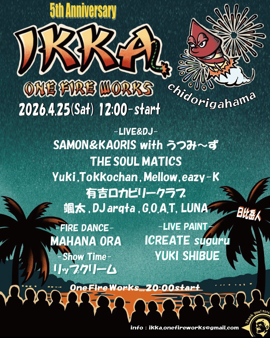 ONE FIRE WORKS 5thAnniversary 住所 南知多町内海浜岡部 駐車場 有(公共交通機関の利用を推奨) Instagram ikka_onefireworks |