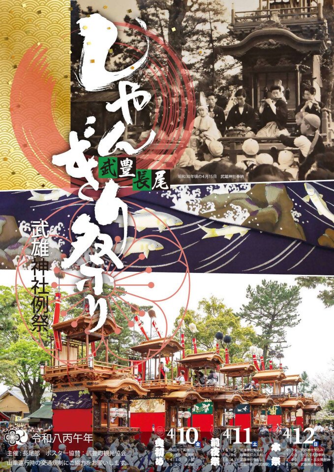 武雄神社例祭 しゃんぎり祭り (たけおじんじゃれいさい) 住所 武豊町上ゲ8(武雄神社) 電話 0569-73-5006(長尾部事務局) 駐車場 臨時駐車場有(公共交通機関の利用を推奨) 公式サイト https://www.town.taketoyo.lg.jp/chousei/1001538/1001552/1002253/1004171.html |