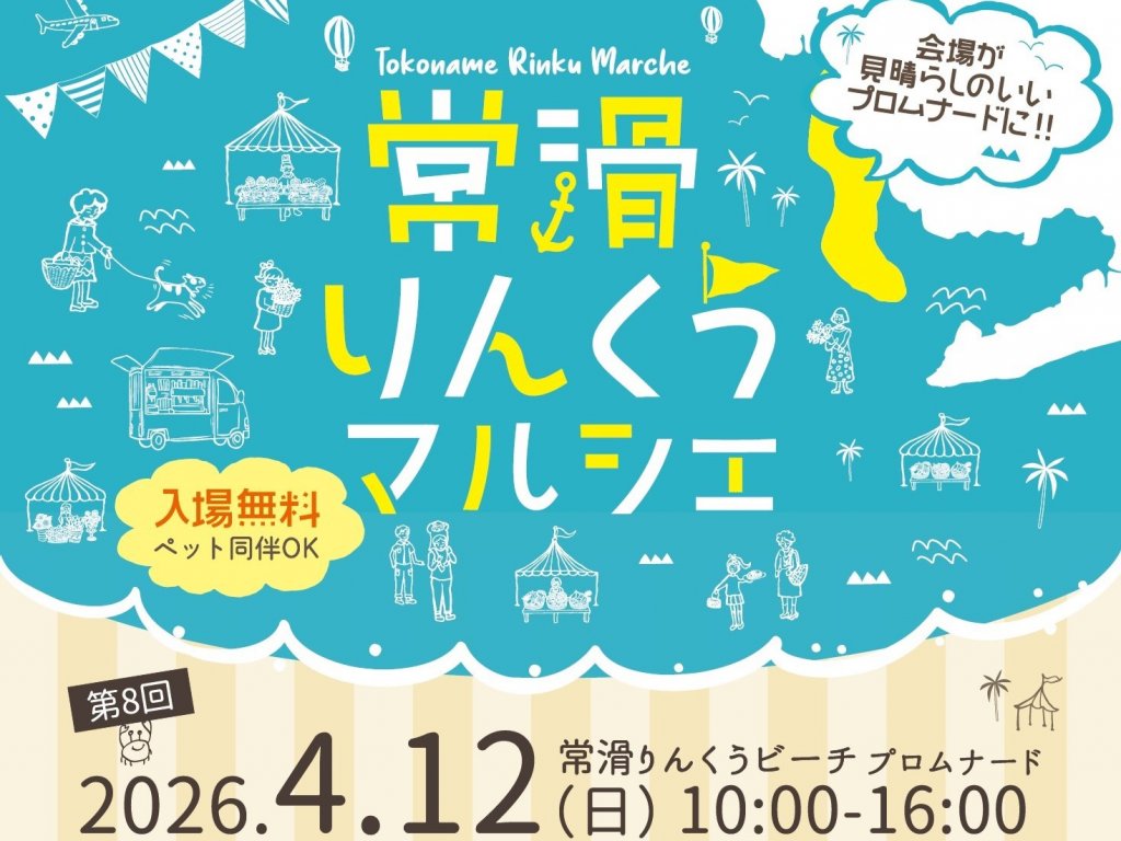 常滑市・りんくうビーチのプロムナードで「第8回 常滑りんくうマルシェ」が、4月12日(日)10:00~16:00に開催されます。※雨天開催