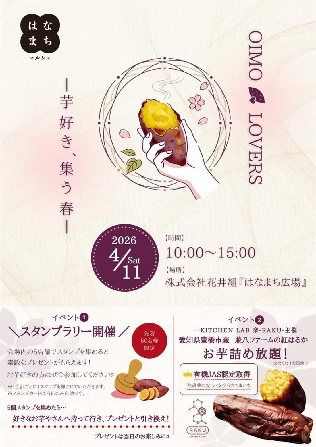 大府市の「はなまち広場」で、こだわりの焼き芋店が集まるイベント「OIMO LOVERS(おいも ラバーズ)」が4月11日(土)10:00~15:00に開催されます。