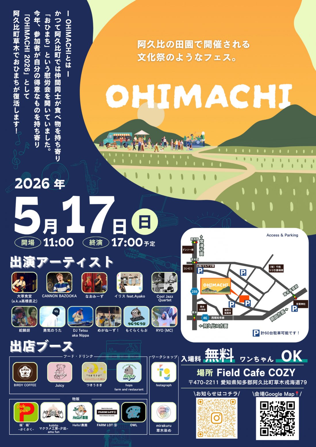 阿久比町の田園風景に囲まれながら音楽とマルシェを子どもから大人まで楽しめるフェス「OHIMACHI(おひまち)」が、阿久比町で5月17日(日)に開催されます。