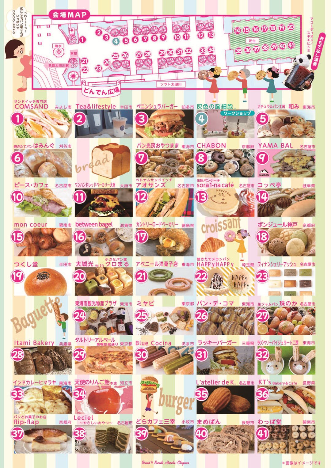 パン&スイーツマルシェ太田川 日時 5月16日(土) 10:00~15:00 場所 どんでん広場(名鉄太田川駅東側) 駐車場 有(名鉄太田川駅東公共駐車場 ※有料) ※混雑が予想されるため公共交通機関の利用推奨 公式サイト http://tm-tokai.com/archives/9692 Instagram tokai_plaza |